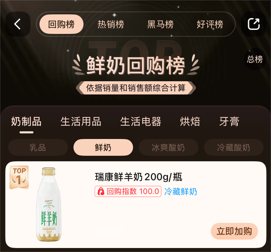 尤为亮眼的是,正在朴朴超市等新零售平台,瑞康鲜羊奶一举夺得“乳品回购榜”取“鲜奶回购榜”双料冠军,稳居朴朴鲜羊奶第一。这一系列成就,不只是一份轻飘飘的市场捷报,更是中国乳成品消费升级海潮中一个极具代表性的深度样本,标记着鲜羊奶品类正从“小众养分选择”加快迈向“支流质量标配”。