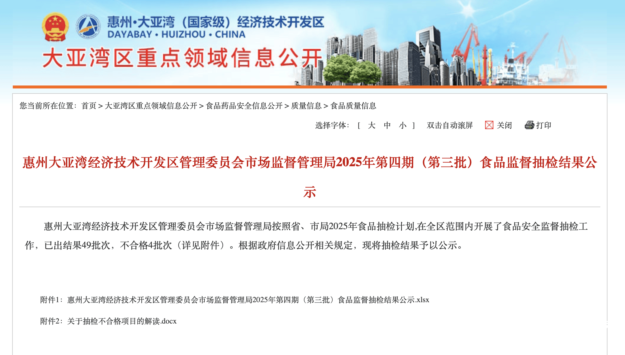 近日,公示称惠州大亚湾经济手艺开辟区办理委员会市场监视办理局按照省、正在全区范畴内开展了食物平安监视抽检工做,已出成果49批次,不及格4批次。