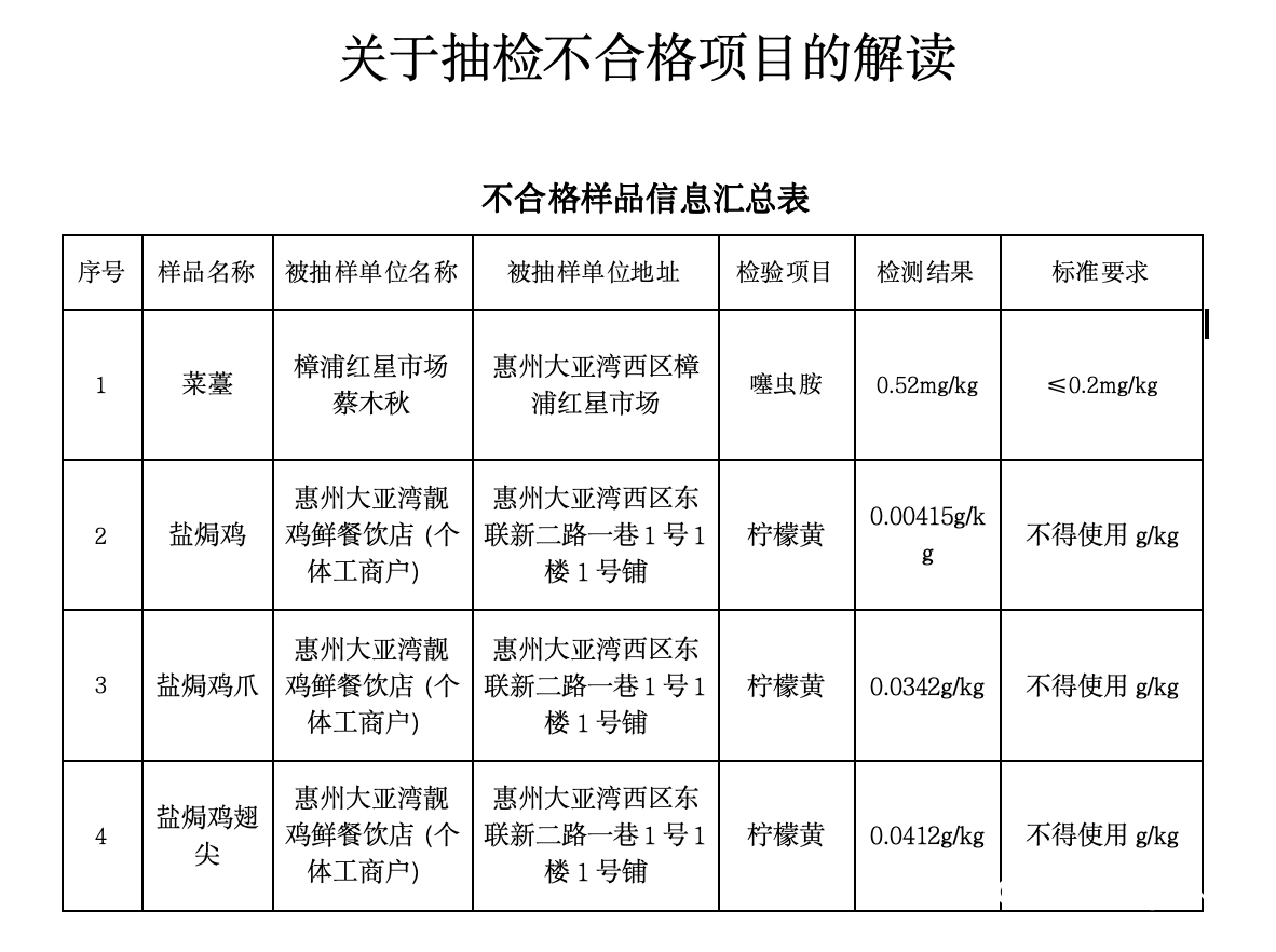 据《惠州大亚湾经济手艺开辟区办理委员会市场监视办理局2025年第四期(第三批)食物监视抽检成果公示》,樟浦红星市场蔡木秋的菜薹被检测出杀虫剂噻虫胺超标,惠州大亚湾靓鸡鲜餐饮店的盐焗鸡、盐焗鸡爪、盐焗鸡翅尖均被检测出不得利用的食物添加剂柠檬黄。